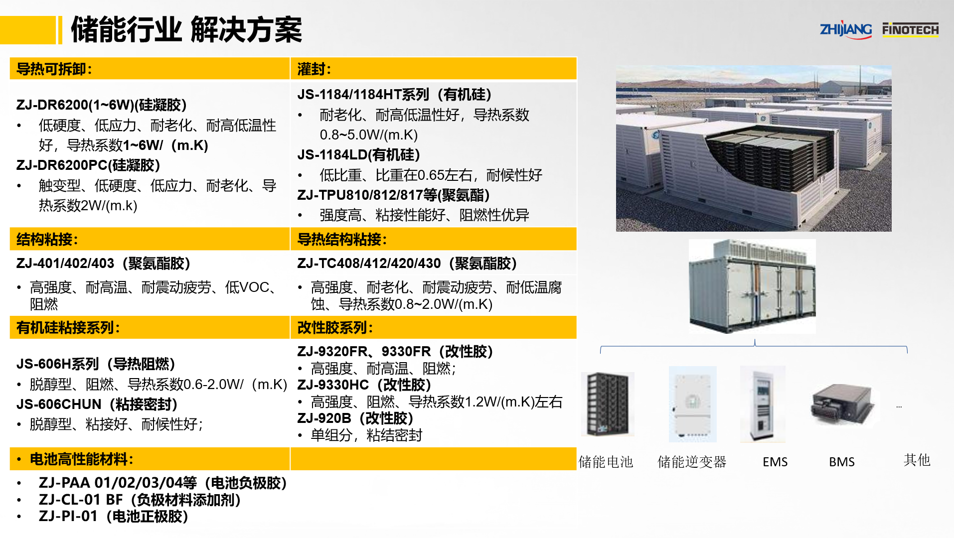 之江公司立足于中國膠粘劑行業領軍企業和有機硅膠、聚氨酯、環氧等專業膠粘劑的產業化優勢,在國家高新技術企業和國家級企業技術中心支撐下,設有CNAS實驗室以及國家級博士后科研工作站,并有國際專家在技術中心工作,通過系統創新為儲能行業提供結構粘接、導熱灌封、密封等多功能高性能解決方案。