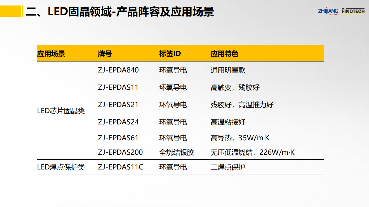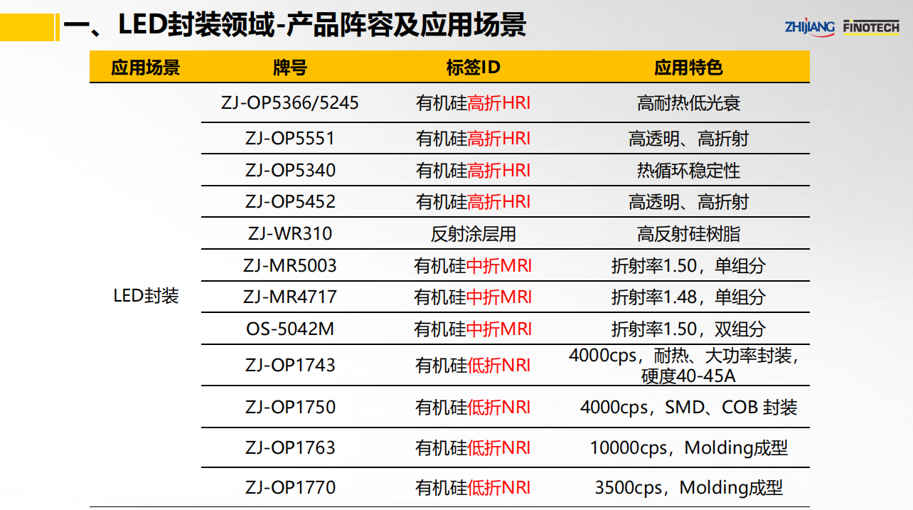 之江公司立足于中國膠粘劑行業領軍企業和有機硅、聚氨酯、環氧等專業膠粘劑的產業化優勢,具有國家級高新技術企業和國家級企業技術中心資質,依靠國家級CNAS實驗室以及國家級博士后科研工作站,并有國際專家助力,為LED封裝行業提供高性能的固晶和封裝解決方案。其中,關鍵產品如下: