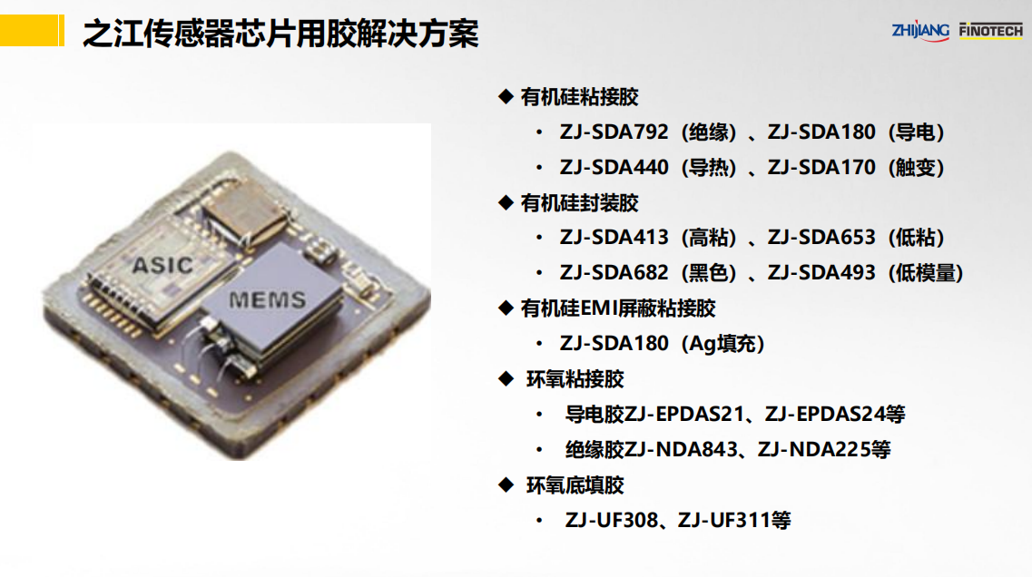 之江公司立足于中國膠粘劑行業領軍企業和有機硅、聚氨酯、環氧等專業膠粘劑的產業化優勢,具有國家級高新技術企業和國家級企業技術中心資質,依靠國家級CNAS實驗室以及國家級博士后科研工作站,并有國際專家助力,為傳感器行業提供高性能的粘接密封解決方案。其中,關鍵產品如下:
